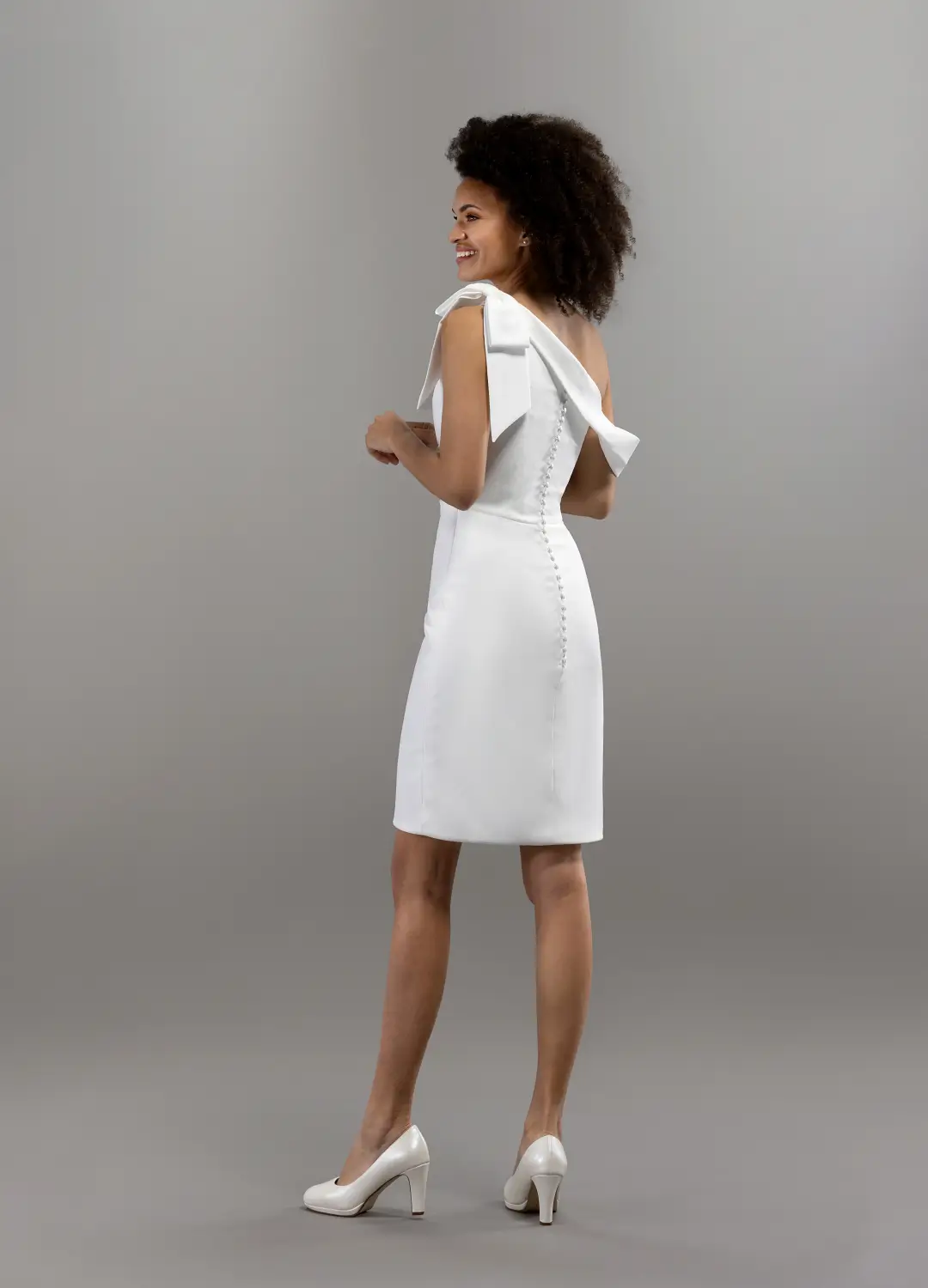 Ein besonderes Highlight ist die kunstvolle One-Shoulder-Lösung mit seitlicher Schleife, die elegant herabfällt und der schlichten Form einen verspielten Touch verleiht. Ideal für das Standesamt, eine urbane Hochzeit oder Bräute, die schlichte Raffinesse suchen
