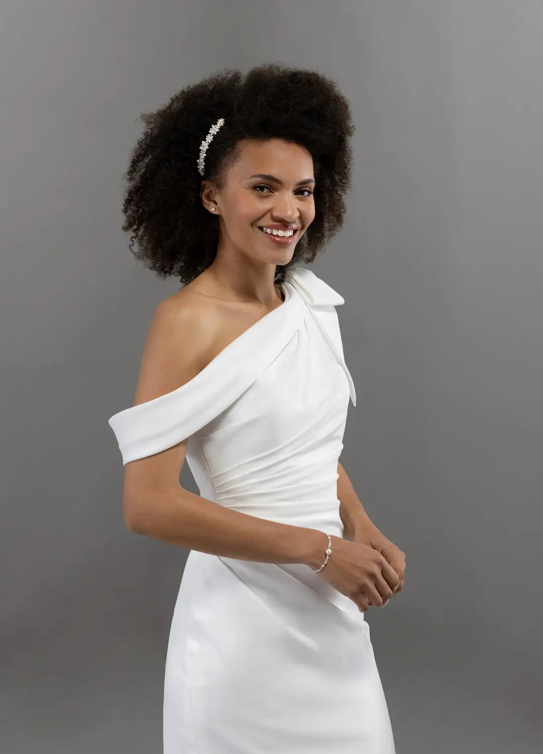 Dieses kurze Brautkleid aus feinem Stretch-Crepe kombiniert Komfort mit moderner Eleganz. Das asymmetrische, drapierte Oberteil betont die feminine Silhouette und verleiht dem Kleid eine dynamische Ausstrahlung.